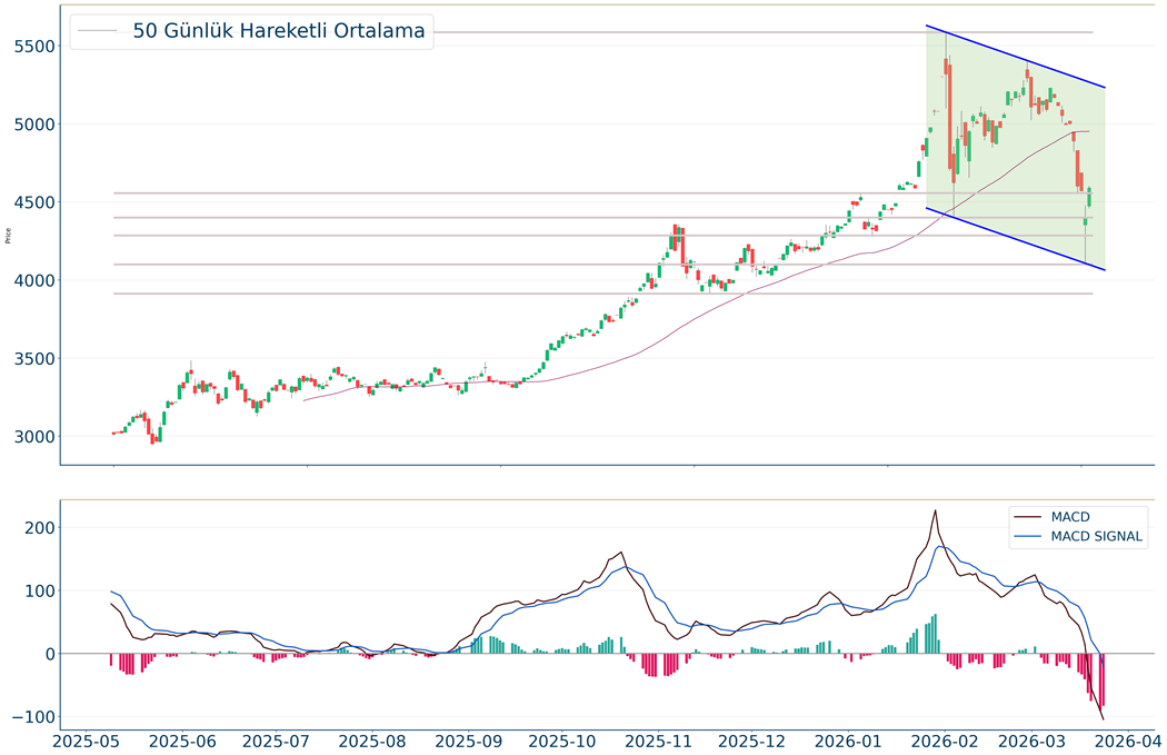 Cuma seansı %4.21 düşüşle tamamladı. Ons Altın 20 günlük hareketli ortalamasının altında kapanış gerçekleştirdi.20-50-200 günlük hareketli ortalamalar 5.029,4.950,4.068 olarak sıralanabilir. 4.552 desteğinin kırılmasıyla birlikte 4.341 seviyesi yeni destek oldu. Daha da aşağı gelinmesi halinde 4.199 seviyesi destek olarak izlenebilir. 4.533-4.608 noktaları ise dirençlerdir.