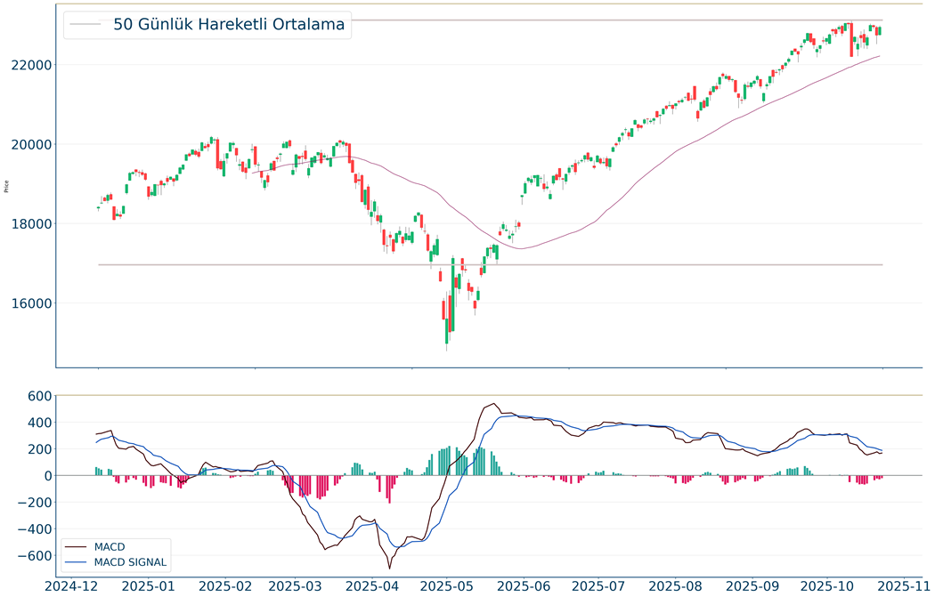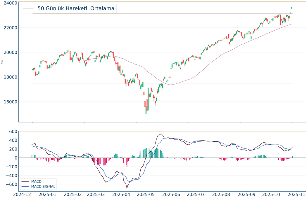 Nasdaq Endeksi kapanışla birlikte %1.86 yükseliş gerçekleştirdi. Güne 23.537 seviyesinde başladı ve gün içinde en yüksek 23.658, en düşük 23.493 seviyesinden işlem gördü. Kapanışı ise 23.637 seviyesinde tamamladı. Kısa vadede pozitif görüntü hakimdir. MACD çizgisi sinyal çizgisinin üzerinde, pozitif bölgede yer alıyor. 23.695 seviyesinin geçilmesi halinde yükseliş eğilimli hareketler izlenebilirken yeni direnç olarak 24.113 karşımıza çıkacaktır. 23.023 ise önemli destek konumundadır. Bu desteğin altına gelinmesi halinde 23.419 yeni destek olarak takip edilebilir.