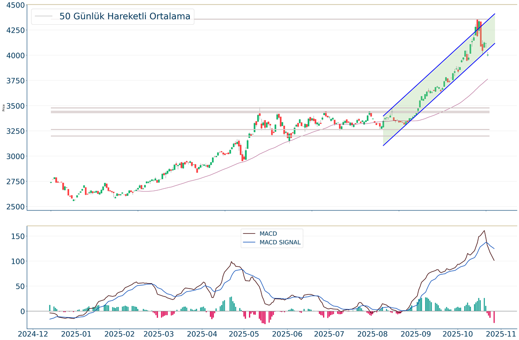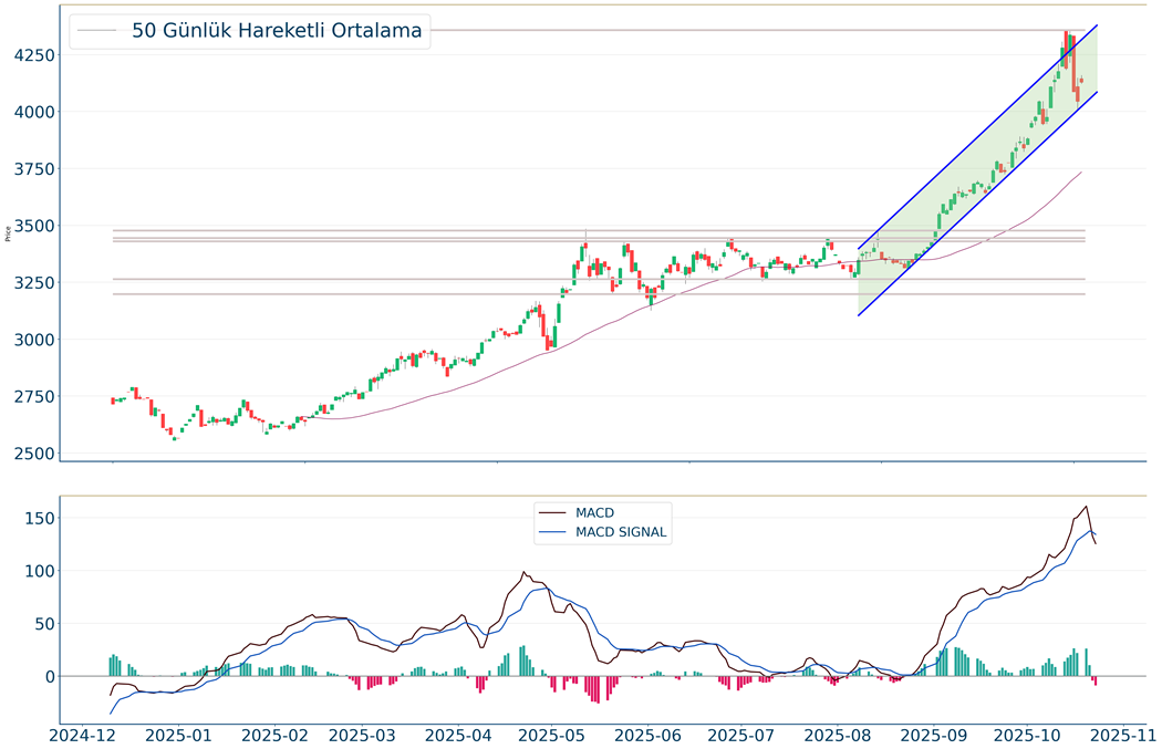 Ons Altın, geçtiğimiz günü %2.75 düşüş ile kapattıktan sonra, 20 günlük hareketli ortalaması olan 4.046 seviyesinin altında fiyatlanıyor. Bu durum Ons Altın için aylık periyotta negatif bir görüntü çiziyor. Son günde yapılan işlemlerde ise en yüksek 4.034 seviyesinde işlem gördükten sonra günü 4.005 seviyesinde tamamladı. Öte yandan, trend göstergelerinden biri olan MACD sat pozisyonunda, pozitif bölgede hareket ediyor. 4.098-4.126 dirençler, 3.973-3.903 destekler olarak değerlendirilebilir.
