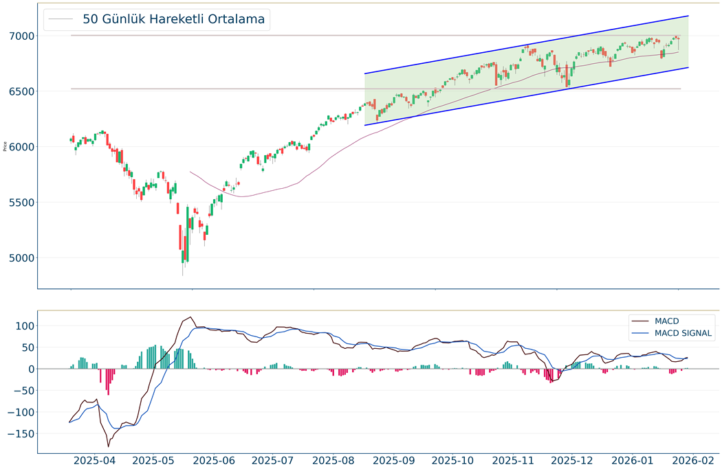 S&P 500 Endeksi kapanışla birlikte %0.01 düşüş gerçekleştirdi. Güne 7.002 seviyesinde başladı ve gün içinde en yüksek 7.002, en düşük 6.963 seviyesinden işlem gördü. Kapanışı ise 6.978 seviyesinde tamamladı. Kısa vadede pozitif görüntü hakimdir. MACD çizgisi sinyal çizgisinin üzerinde, pozitif bölgede yer alıyor. Yukarı yönlü hareketlerde izlenebilecek birinci direnç 7.129 olurken destek olarak 6.928 izlenebilir.