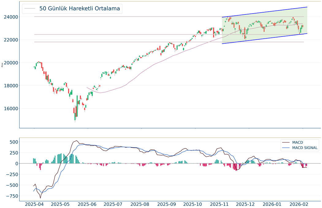 Nasdaq Endeksi kapanışla birlikte %1.59 düşüş gerçekleştirdi. Güne 22.604 seviyesinde başladı ve gün içinde en yüksek 22.841, en düşük 22.461 seviyesinden işlem gördü. Kapanışı ise 22.540 seviyesinde tamamladı. Kısa vadede negatif görüntü hakimdir. MACD çizgileri sat konumunda, sıfır çizgisinin altında hareket ediyor. 22.696 desteğinin kırılmasıyla birlikte 22.389 seviyesi yeni destek oldu. Daha da aşağı gelinmesi halinde 21.935 seviyesi destek olarak izlenebilir. 23.127-23.310 noktaları ise dirençlerdir.