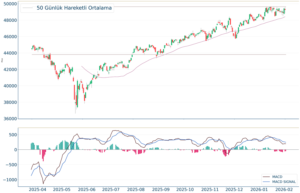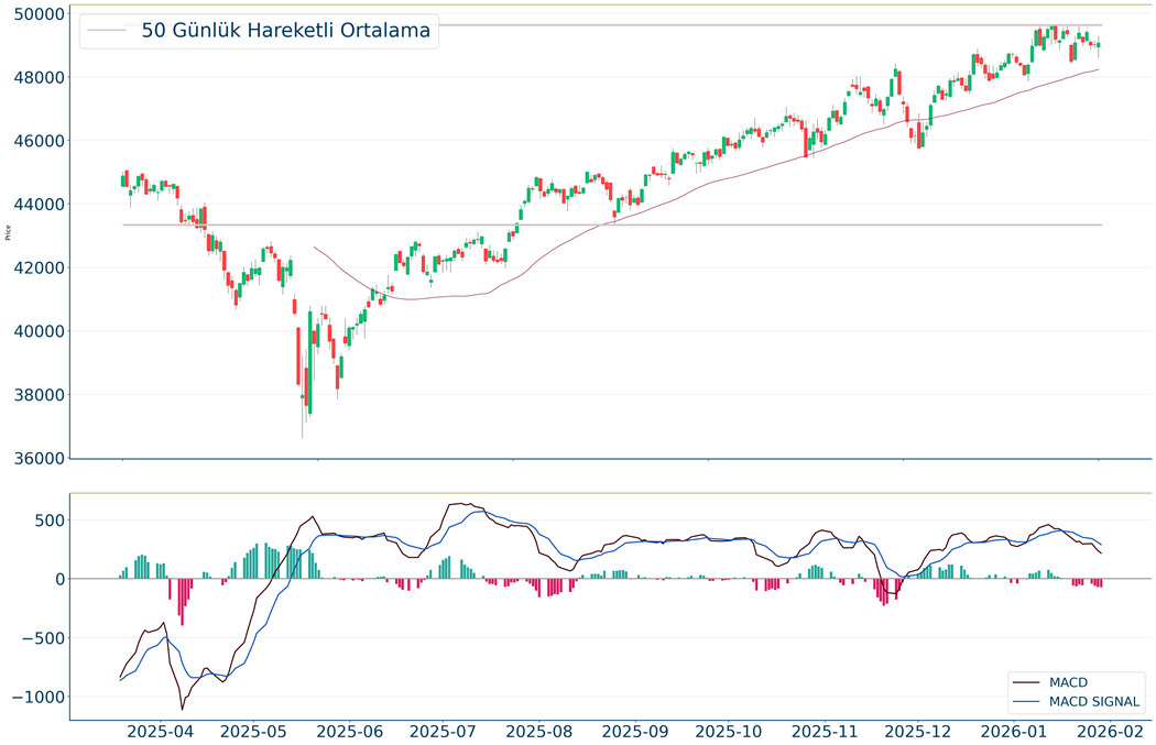 Dow Jones Endeksi geçtiğimiz gün %0.02 artarak 49.015 seviyelerinden işlem görüyorken 50 günlük hareketli ortalaması olan 48.201 seviyesinin de %2 üzerinde seyrediyor. Bu seviyeye göre Dow Jones Endeksi için orta vadeli negatif görünüm hakimdir. Destek ve direnç seviyeleri; Gün içinde pozitif performans gerçekleşmesi halinde 50.064-50.320 direnç, negatif performans gerçekleşmesi halinde ise 48.655-47.914 destek seviyeleri olarak izlenebilir.