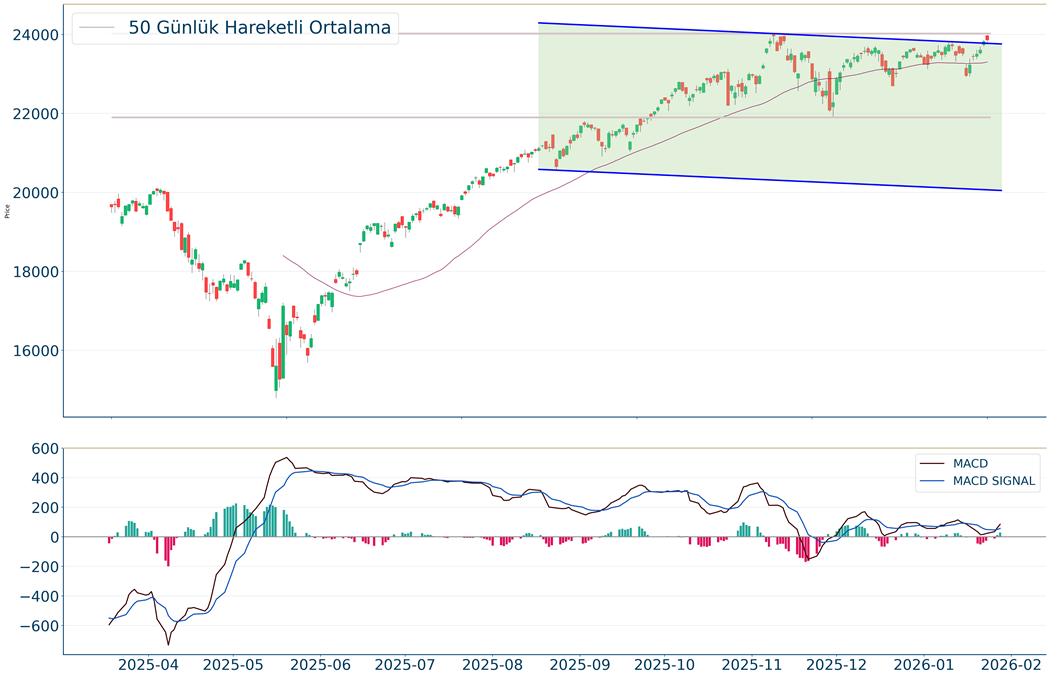 Nasdaq Endeksi kapanışla birlikte %0.91 yükseliş gerçekleştirdi. Güne 23.734 seviyesinde başladı ve gün içinde en yüksek 23.865, en düşük 23.694 seviyesinden işlem gördü. Kapanışı ise 23.817 seviyesinde tamamladı. Kısa vadede pozitif görüntü hakimdir. MACD çizgisi sinyal çizgisinin üzerinde, pozitif bölgede yer alıyor. Yükseliş halinde ilk direnç olarak 24.311 seviyesi takip edilirken bu direncin de geçilmesi halinde 24.461 takip edilebilir. Negatif hareketlerde ise destekler 23.610 ve 23.243 olarak izlenebilir.