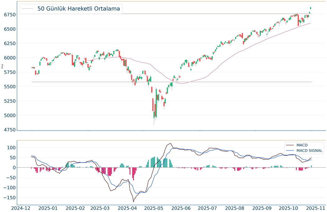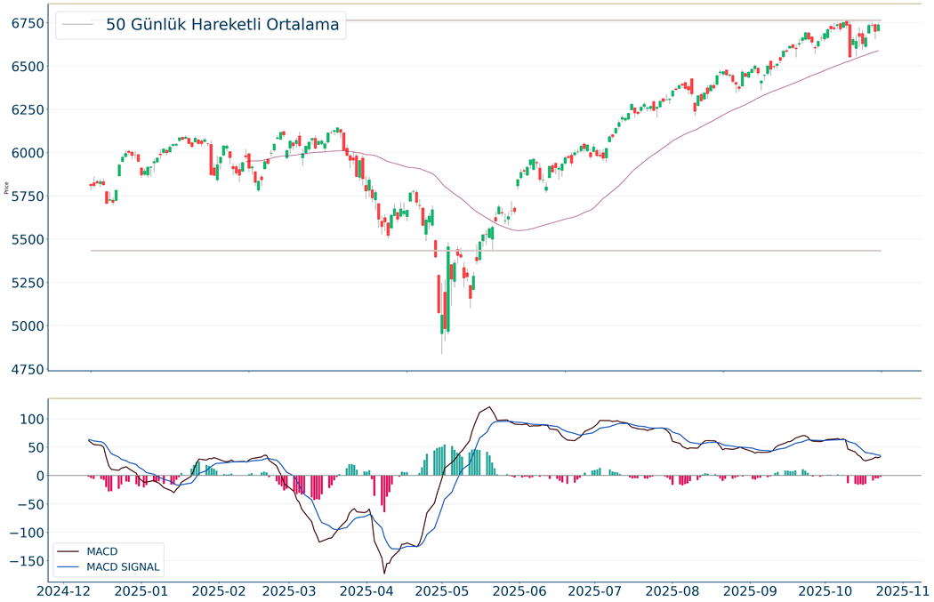 S&P 500 Endeksi, geçtiğimiz günü %0.53 düşüş ile kapattıktan sonra, 20 günlük hareketli ortalaması olan 6.683 seviyesinin üzerinde fiyatlanıyor. Bu durum S&P 500 Endeksi için aylık periyotta pozitif bir görüntü çiziyor. Son günde yapılan işlemlerde ise en yüksek 6.741 seviyesinde işlem gördükten sonra günü 6.699 seviyesinde tamamladı. Öte yandan, trend göstergelerinden biri olan MACD çizgisi sinyal çizgisinin altında, pozitif bölgede yer alıyor. 6.850-6.902 dirençler, 6.640-6.522 destekler olarak değerlendirilebilir.