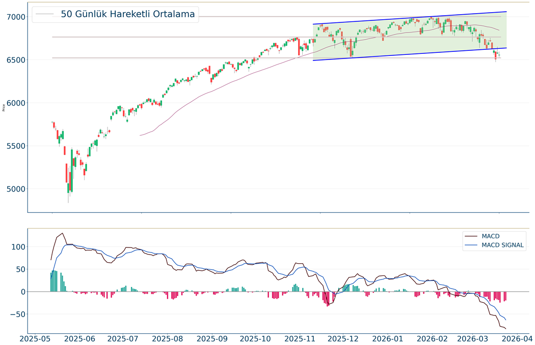 S&P 500 Endeksi geçtiğimiz gün %1.36 azalarak 6.624 seviyelerinden işlem görüyorken 50 günlük hareketli ortalaması olan 6.872 seviyesinin de %4 altında seyrediyor. Bu seviyeye göre S&P 500 Endeksi için orta vadeli pozitif görünüm hakimdir. Destek ve direnç seviyeleri; Gün kapanışına göre 6.673 desteği kırıldı. Yeni destekler 6.588-6.462 haline geldi. 6.796-6.838 noktaları ise dirençler olarak takip edilebilir.
