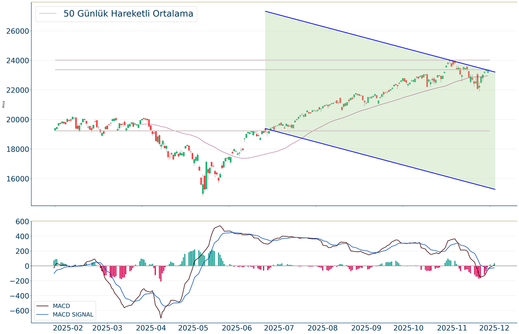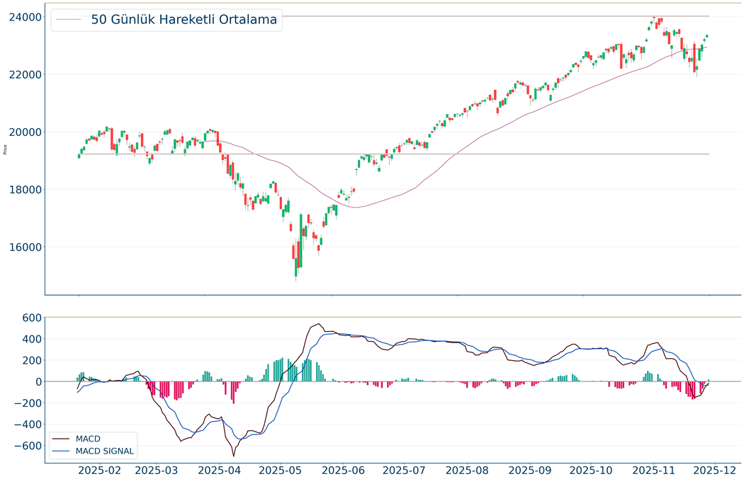 Nasdaq Endeksi kapanışla birlikte %0.82 yükseliş gerçekleştirdi. Güne 23.163 seviyesinde başladı ve gün içinde en yüksek 23.280, en düşük 23.074 seviyesinden işlem gördü. Kapanışı ise 23.214 seviyesinde tamamladı. Son kapanış 5 günlük hareketli ortalamanın üzerinde gerçekleşti. MACD çizgileri sat konumunda, sıfır çizgisinin altında hareket ediyor. Yukarı yönlü hareketlerde izlenebilecek birinci direnç 23.702 olurken destek olarak 23.006 izlenebilir.