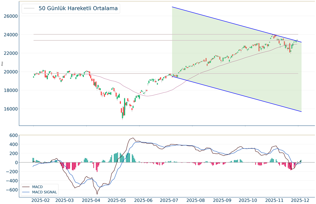 Nasdaq Endeksi kapanışla birlikte %0.17 yükseliş gerçekleştirdi. Güne 23.315 seviyesinde başladı ve gün içinde en yüksek 23.499, en düşük 23.271 seviyesinden işlem gördü. Kapanışı ise 23.454 seviyesinde tamamladı. Kısa vadede pozitif görüntü hakimdir. MACD çizgileri al konumunda, sıfır çizgisinin üzerinde hareket ediyor. Gün içinde pozitif performans gerçekleşmesi halinde 23.932-24.107 direnç, negatif performans gerçekleşmesi halinde ise 23.223-22.849 destek seviyeleri olarak izlenebilir.