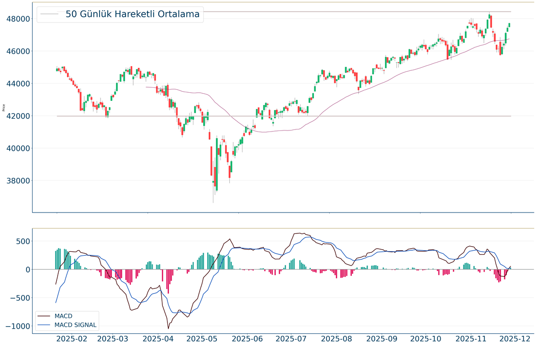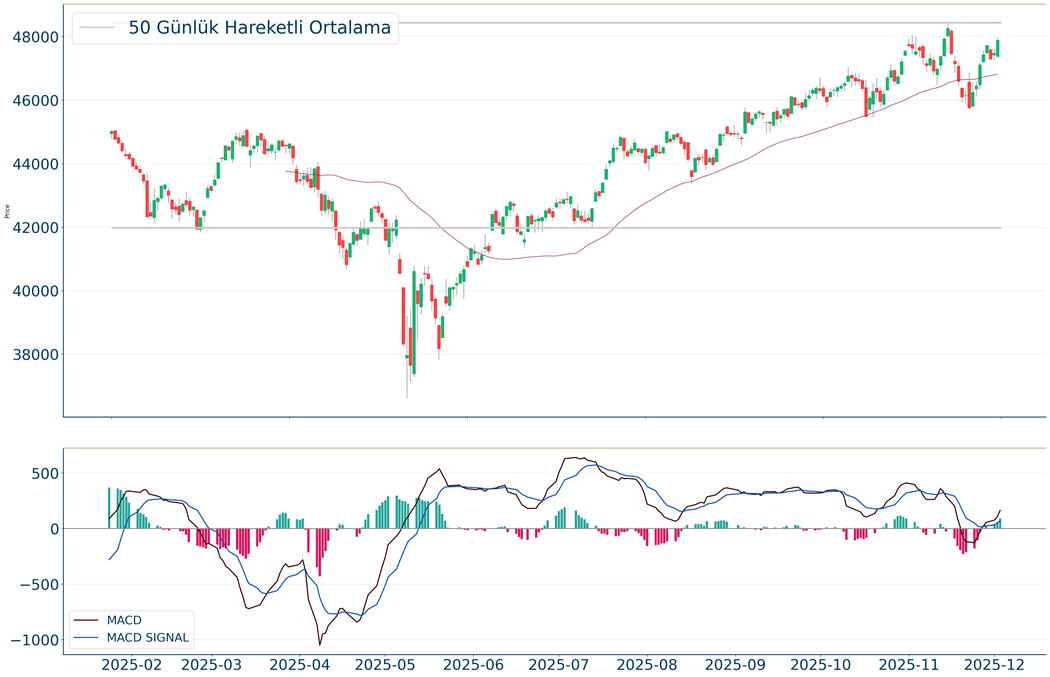 Dow Jones Endeksi, geçtiğimiz günü %0.67 yükseliş ile kapattıktan sonra, 20 günlük hareketli ortalaması olan 47.033 seviyesinin üzerinde fiyatlanıyor. Bu durum Dow Jones Endeksi için aylık periyotta pozitif bir görüntü çiziyor. Son günde yapılan işlemlerde ise en yüksek 47.571 seviyesinde işlem gördükten sonra günü 47.427 seviyesinde tamamladı. Öte yandan, trend göstergelerinden biri olan MACD çizgileri sat konumunda, sıfır çizgisinin altında hareket ediyor. 48.434-48.737 dirençler, 47.026-46.277 destekler olarak değerlendirilebilir.