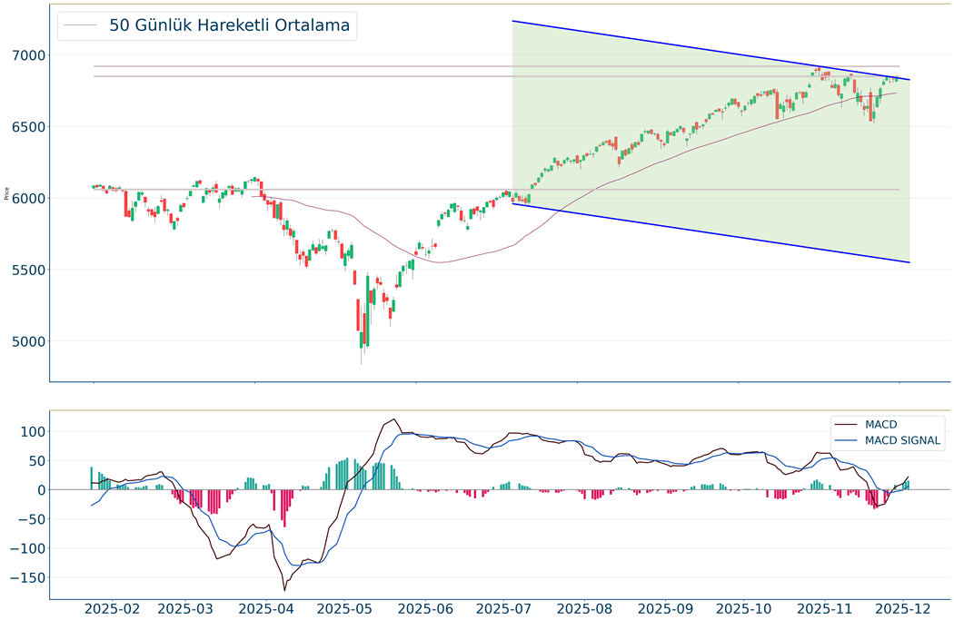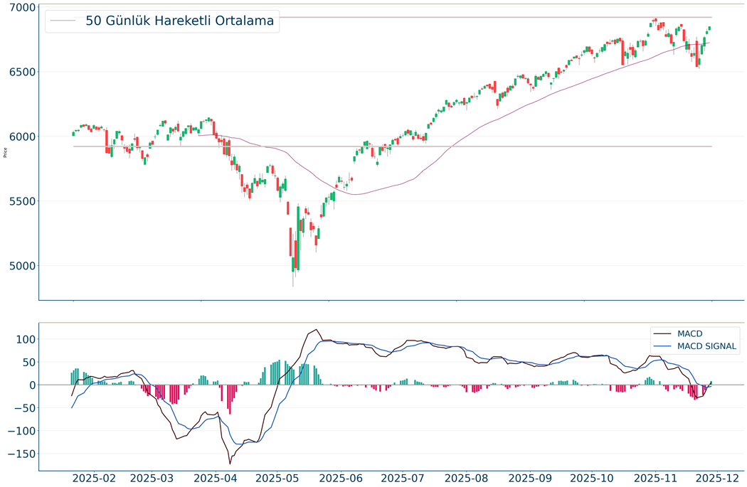 Şükran günü resmî tatili sebebi ile ABD piyasalarının yarım gün açık kaldığı cuma gününü majör ABD endeksleri %0,5-%0,7 arası kazanımlarla tamamladı. Sektörel bazda ise artan WTI ham petrol fiyatlarına paralel olarak %1,3 değer kazanan S&P 500 Enerji Sektörü Endeksi günün en fazla yükselen sektör endeksi oldu. ABD 10 yıllık tahvil faizleri ise kritik %4,0 düzeyine yakın seyrini sürdürdü. Bugüne hem Avrupa hem de ABD borsalarının satıcılı başlaması bekleniyor. Makroekonomik tarafta bugün ABD PMI verilerini takip edeceğiz. Bilanço tarafında ise Credo Technology (CRDO) ve MongoDB (MDB) finansallarını takip edeceğiz. S&P 500’de yükseliş halinde ilk direnç olarak 6.986 seviyesi takip edilirken bu direncin de geçilmesi halinde 7.024 takip edilebilir. Negatif hareketlerde ise destekler 6.790 ve 6.692 olarak izlenebilir.